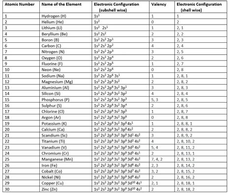 atomic number 1 to 30 with electronic configuration